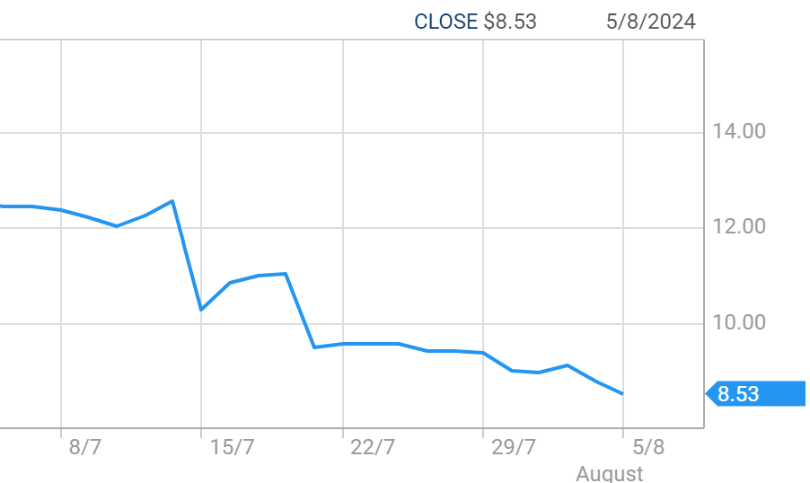 In three weeks it has shrunk from $12.56 to $8.53, a 32% drop valued at $500 million.