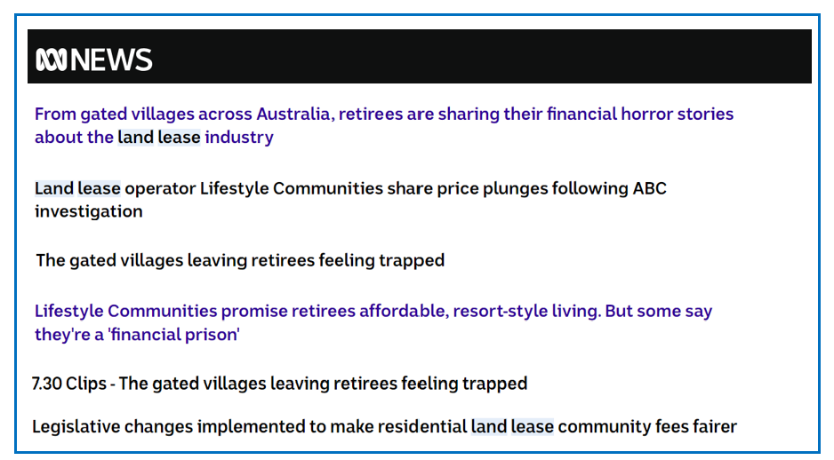 The ABC News has run six negative stories between 7 June and 29 July, pulling in the full land lease sector – see below.