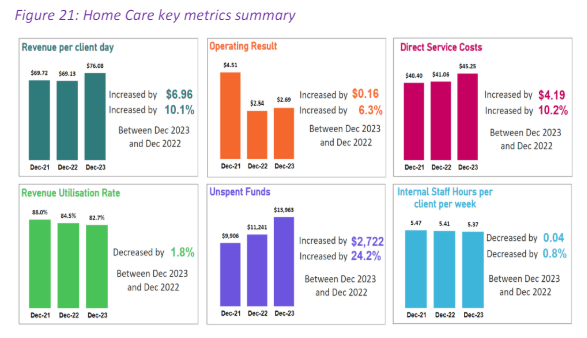 StewartBrown noted the home care sector operates with "uncertainty" while still largely unknown reforms are set to come in with the new Support at Home Program due on 1 July 2025. For the six months to December 2023, home care operators recorded a surplus of $2.69 per client per day (pcpd), slightly higher than the $2.54 recorded in the pcp. Unspent funds rose to an average of $13,963 for every home care recipient, making an estimated total of more than $3.7 billion in unspent funds being held by providers and the Government, as revenue utilisation decreased to 82.7% from 84.5% in the pcp.