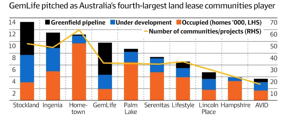 Today, GemLife has 12 communities in operation, with prices at its latest resort Moreton Bay starting from $785,000. A presentation deck in front of fund managers pitches GemLife as the owner of 32 communities, making it Australia’s fourth-largest land lease community operator. The modelling shows it is nudging 10,000 sites, putting it Stockland’s Halcyon brand, Ingenia Communities and Sun Communities joint venture, and US player Hometown’s local business.