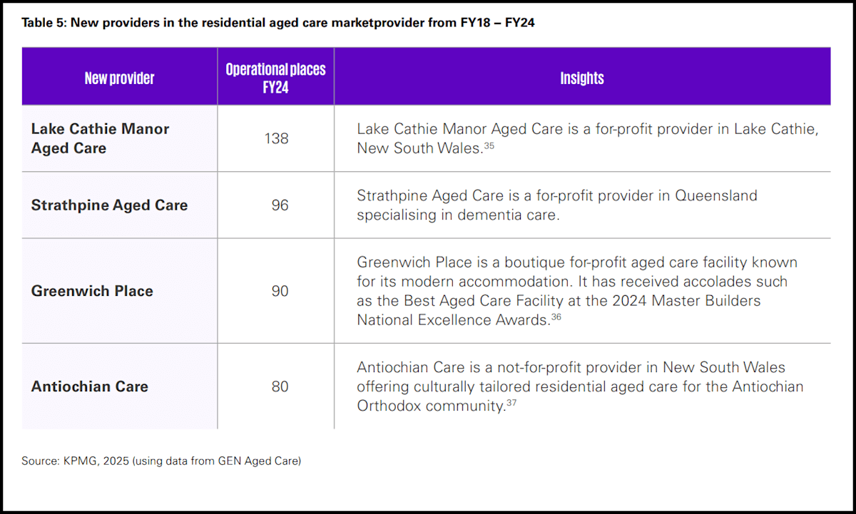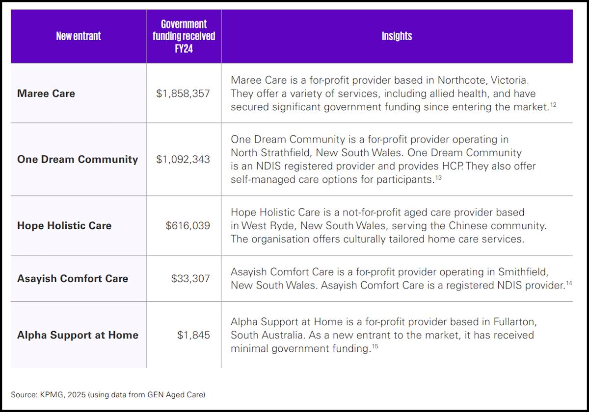 KPMG’s latest deep dive into the aged care sector is released today and it confirms what many of us already know. Demand is rising. So is the money. But the sector? It’s still shrinking. Take home care. Government funding soared 29.2% to $8.8 billion in FY24. But the number of people receiving a Home Care Package only grew by 6.6%. The waitlist keeps ballooning. Just five new home care providers entered the market – mostly NDIS players expanding into aged care. And their share of Government funding? Barely a ripple – see below.