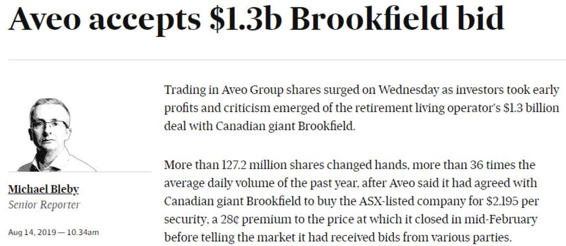 Yesterday Aveo announced agreement to be purchased by the huge Canadian investment fund Brookfield. This is good news for retirement village operators – and managers.