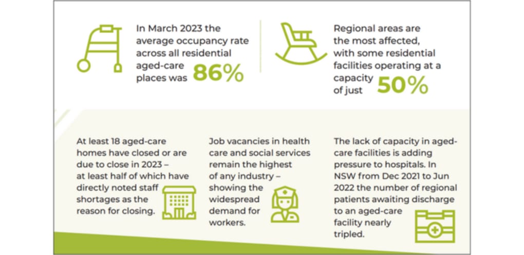 One in seven aged care home beds sits empty with many operators operating below full capacity due to worker shortages, with some operating at 50% capacity, states the report.