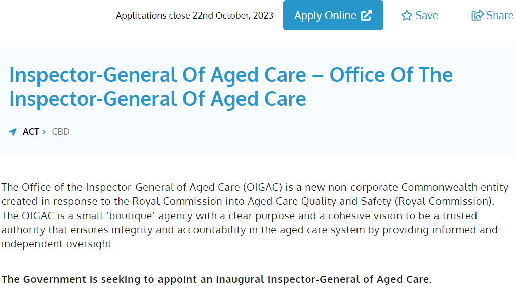 At the StewartBrown Financial Forum in Sydney on Tuesday Ian Yates the Interim Inspector-General of Aged Care, explained the role of the Inspector General is to “shine an independent light’ on the aged care sector and report direct to government. The role has similar powers to the Auditor General and can request (demand) information from all parties in aged care. He explained the role is to identify both ‘systemic’ problems as well as positive innovations. The Inspector-General will also monitor and report on the Government’s implementation of the Royal Commission’s recommendations. In March 2023, he also told The SOURCE that a report on the Government’s implementation of the Royal Commission’s recommendations will be handed down later this year. Meanwhile the first formal Inspector General is being recruited. Check out the job ad HERE. The SOURCE: Who will fill this new role? Ian Yates’ shoes are big ones to fill.
