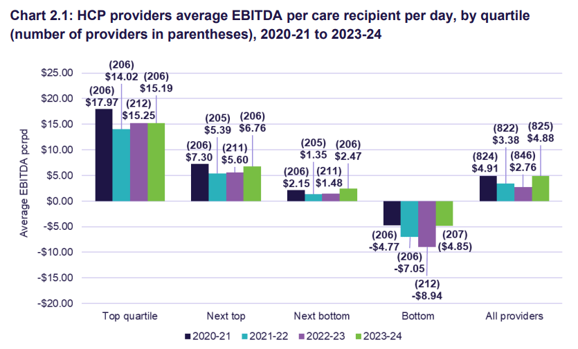 The Department of Health, Disability, and Ageing's Financial Report on the Australian Aged Care Sector 2023-24 showed EBITDA for home care increased 77% over the year to $4.88 per care recipient per day driven by improved results for the bottom three quartiles.