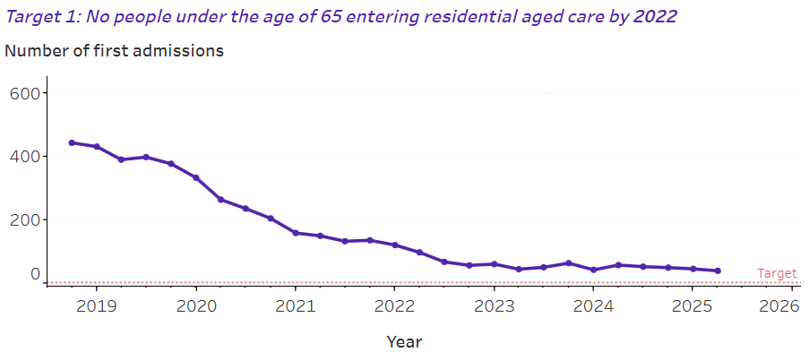 In 2019, the Federal Government set a target of having no people under the age of 65 living in residential aged care by 2025 in response to a recommendation of the Royal Commission into Aged Care Quality and Safety. New data from the Department of Health, Disability and Ageing shows that as of 31 March 2025, 959 younger people (defined as a person under 65 years of age) are still living in aged care homes across the country.