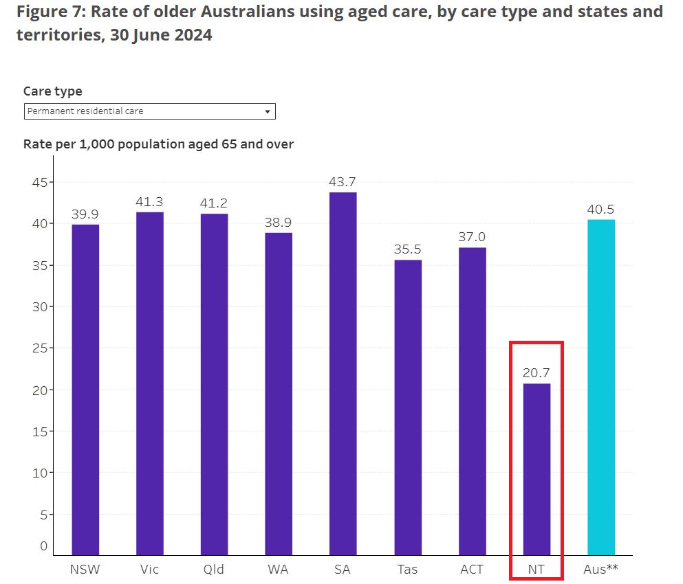 The Northern Territory's rate of residential aged care use is half the rate of the national average - see chart above.