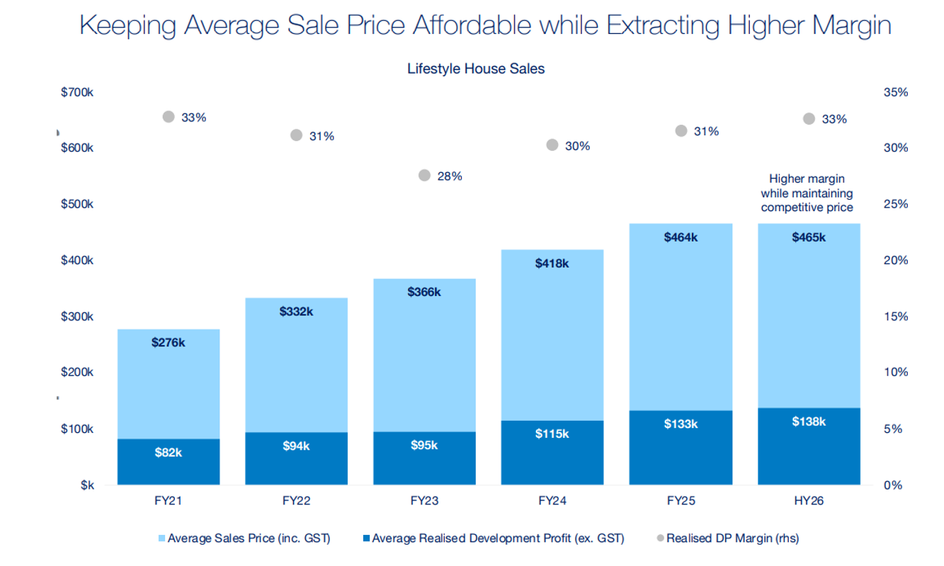 Lifestyle house settlements increased 143% to 73. The realised development margin profit of 32% was 30% above target.