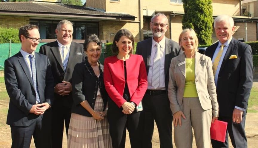 Pictured: Minister for Social Housing Pru Goward (third from left), Premier Gladys Berejiklian (centre) and BaptistCare CEO Ross Low (far right).