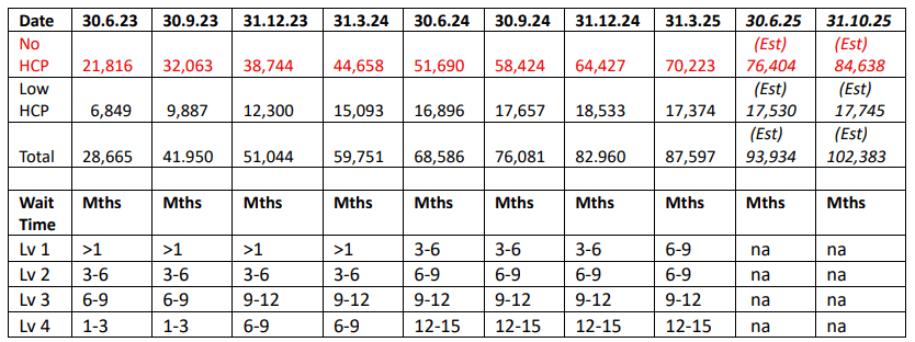 The home care waiting list was at a record high as of 31 March 2019, when 129,038 people were waiting for their correct level of Home Care Package. At the time, 53,299 had a Home Care Package at a lower level than their assessed need, while 75,739 had no Home Care Package at all. Ian estimates that as of 30 June 2025, there were nearly 94,000 waiting for their correct level of Home Care Package, with 76,000 having no access to a Home Care Package at all (see table above). He concluded "the issues this Inquiry is examining will be repeated over time until we have a needs-based provision of services", a recommendation he has made several times.