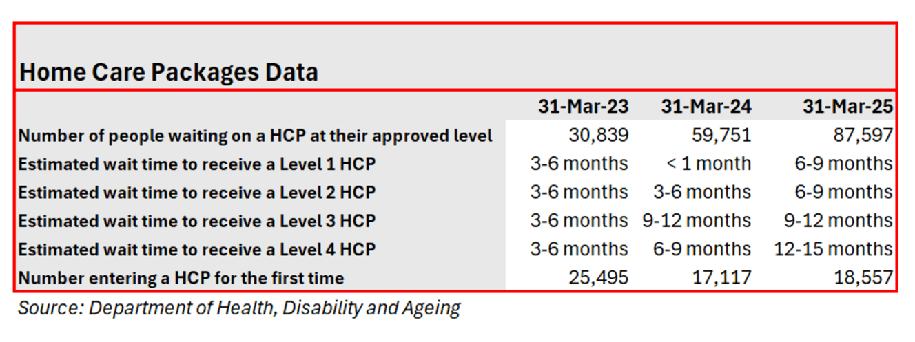 New Home Care Packages are only being released when someone on a package passes or enters residential aged care. With 87,597 older Australians waiting for the level of Home Care they have been assessed as needing as of 31 March 2025, providers are bearing the brunt.