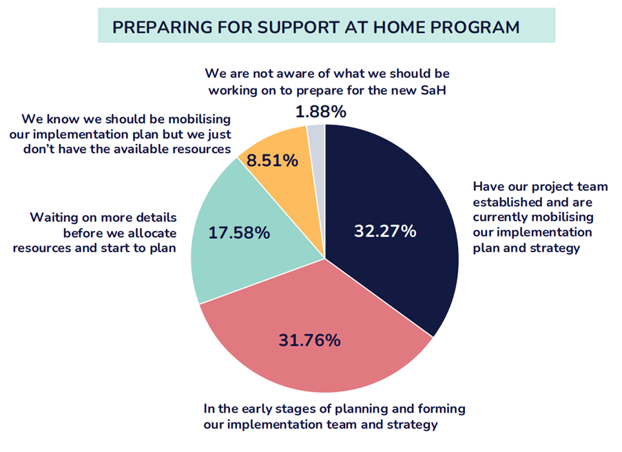 “25% of our funding costs have been slashed,” said one respondent. “We are expected to meet new quality standards, but there’s no money to fund the workforce to do this.” With less than five months to go until the new Aged Care Act and regulatory model are due to begin, providers said their top priority for the year is implementation. Yet just 47% have appointed a project lead and begun actively planning. Even fewer – only 32% – have started implementing a strategy for Support at Home.