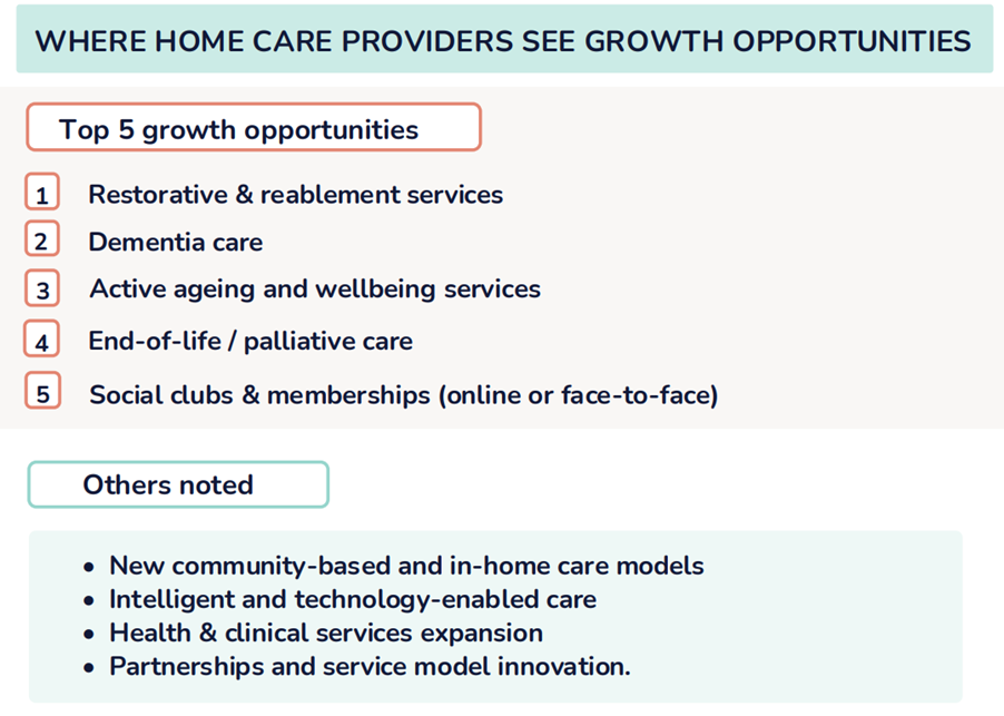 “Support at Home appears to be steering providers toward clinical services,” said one respondent. “There’s a real opportunity here – but funding must be sustainable.” Others noted that the pace and pressure of aged care reform is already limiting their ability to innovate.