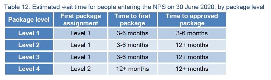 Check out the graph above. As you can see, older Australians approved for Level 1, 2 or 3 packages had an estimated wait of between three to six months to receive their first package – a Level 1. Those waiting for a Level 4 package waited over 12 months – to receive a Level 2, plus another 12-plus month wait to receive their approved package.