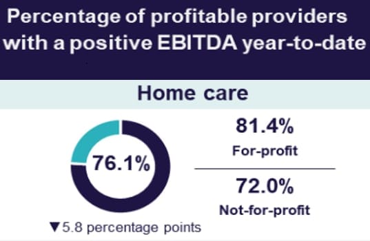 According to StewartBrown, home care providers will need to increase their margins through increased pricing and improved revenue utilisation to claw back the cash they will lose thanks to the incoming 10% care management cap and removal of Package management fees under Support at Home. Fewer profitable home care providers Elsewhere, the report showed fewer home care providers reported positive earnings before interest, tax, depreciation and amortisation. In Q3 2024-25, 76.1% of providers reported positive EBITDA, down 5.8 percentage points from the year prior – see the graphic on the right.