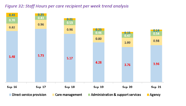 Staffing hours have marginally increased from September FY20 to 5.62 hours, with a slight rise in direct care hours to 3.96 hours. StewartBrown Senior Partner Grant Corderoy stressed that this was not related to the quality of service delivery, but rather reflects the difficulties in finding staff to deliver services, which in turn impacts on revenue and care delivery.