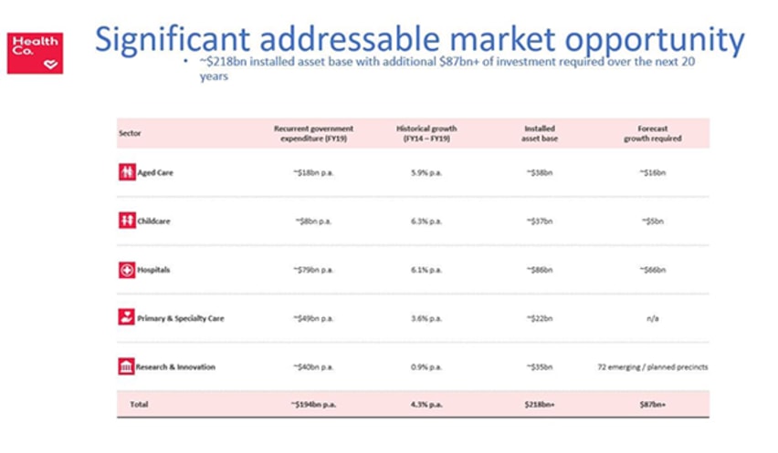 HealthCo already has a $400 million fully undrawn committed debt facility lined up and has promised to target a range of healthcare sub-sectors including childcare, aged care, primary medical, hospitals and life sciences.