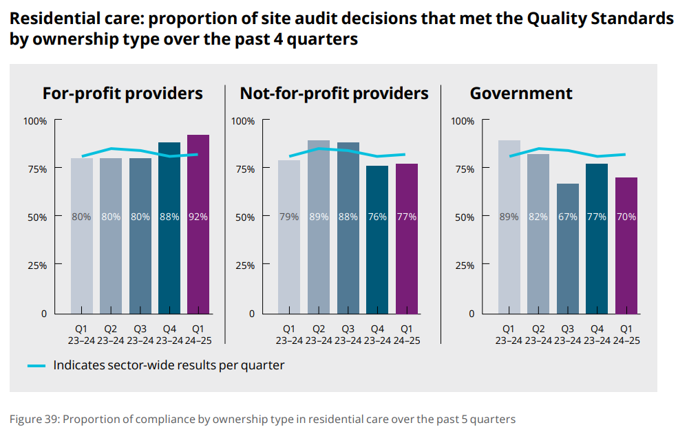 92% of the ACQSC's compliance decisions for homes with For Profit operators found the home achieved full compliance with the Aged Care Quality Standards, compared with only 77% for Not For Profit operators and 70% for Government-owned homes. For Profit operators saw their compliance increase 4 percentage points in the quarter to be 10 percentage points above the sector average. Not For Profit provider's compliance rates are below the sector average. The ACQSC states that it is also investigating these trends.
