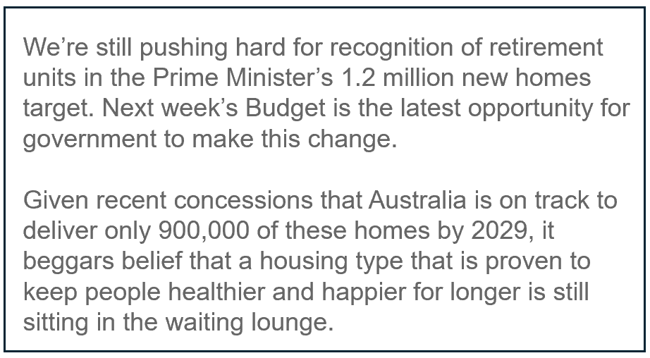 We are also confident that retirement villages will be positively acknowledged as efficient locations to deliver care. The Federal Department of Health and Aged Care recognises villages in its planning documents, in part based on the RLC White Papers.