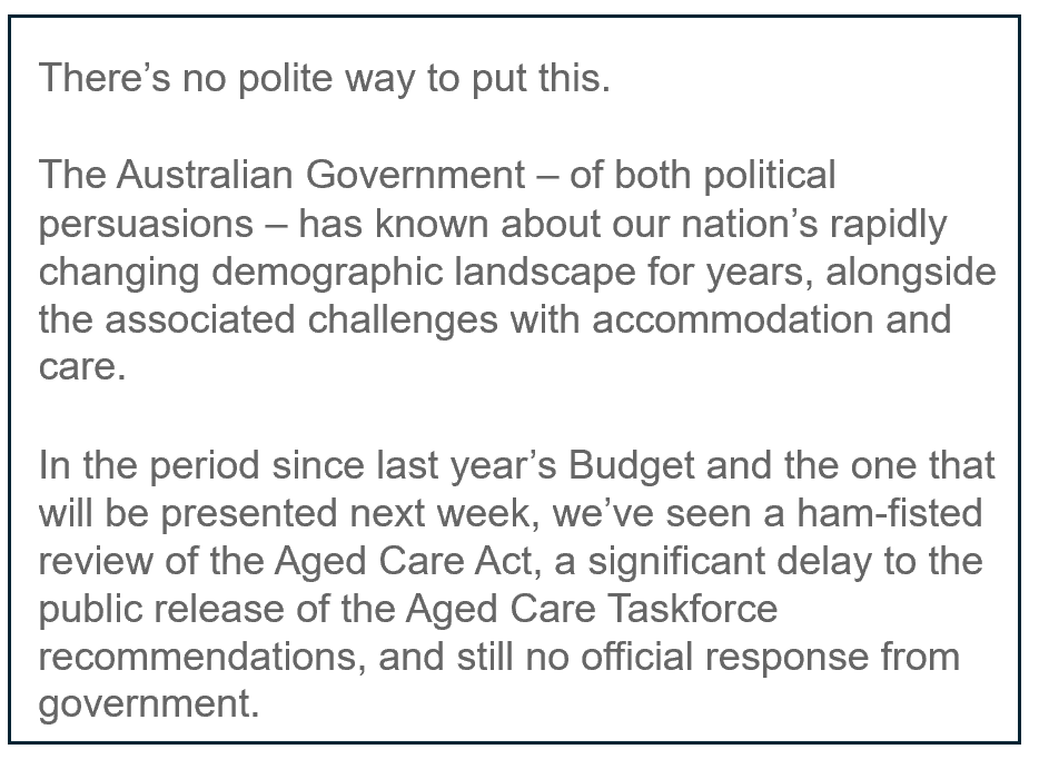 Credit to Daniel Gannon, Executive Director of the Retirement Living Council, who came out swinging in his regular newsletter following the leaked news that the Federal Government was not going to address the recommendations of the Aged Care Taskforce in tonight’s budget.