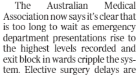 On page 5 of The Australian today the Australian Medical Association is going to the media to say that hospitals across the country are experiencing the highest levels on record of emergency presentations and bed blockers. Many are retirement...