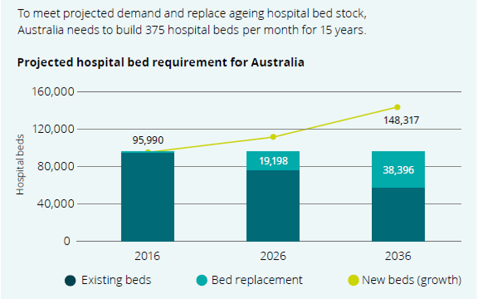 Deloitte has done a study on increasing demand for hospital beds (see the graph below). Virtually none are being built let alone refurbished. Deloitte states we need 580 new hospital beds built every month for the next 15 years.