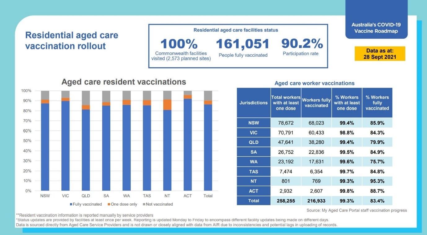 According to data provided on Monday, 99.7% of all aged care workers in Tasmania, 99.6% of all aged care workers in WA, 99.5% of all aged care workers in SA, and 99.4% of all aged care workers in NSW and QLD have received at least one dose of a COVID-19 vaccine. You can read the full story here.