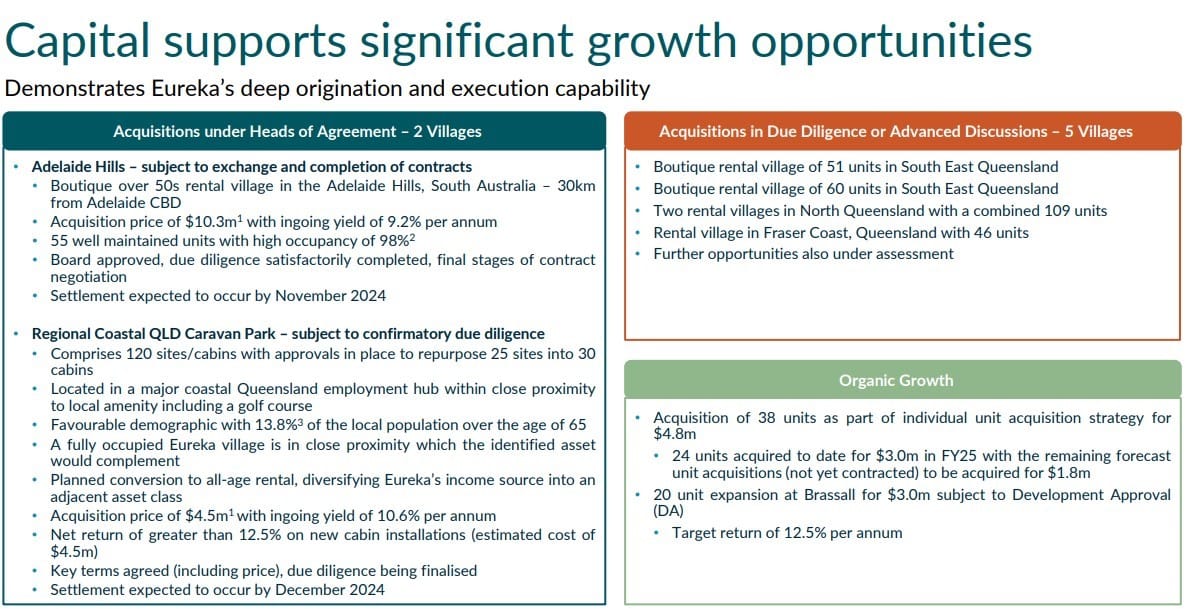 Eureka is in due diligence to buy 441 units in seven villages and, in addition, has bought or is in the process of buying 38 single units across four managed villages for a total of $49.9 million. It has also identified expansion of villages costing $7.5 million.