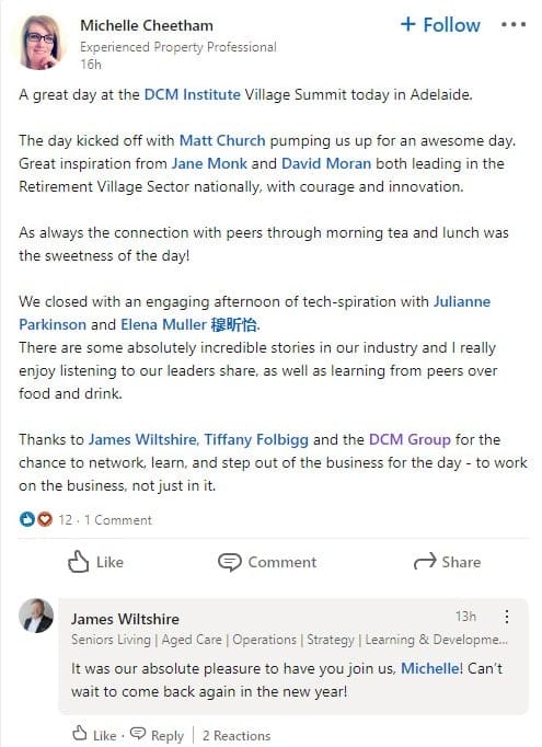 “Informative, fun and uplifting,” was the comment from one delegate who attended VILLAGE SUMMIT earlier this week. DCM Institute’s annual event for village professionals commenced in Perth on Tuesday and continued on to Adelaide yesterday. There was a shared sense of optimism and excitement for the seniors living sector as leaders and executives shared their vision for the future. Inspiration Becomes A Reality Australia’s leading motivational speaker, Matt Church (pictured above), was live and in person both cities – as he will be for upcoming dates in Melbourne, Brisbane and Sydney. “Village professionals are not simply custodians of property,” Matt said in his presentation which spoke to above the line leadership. Matt went on to challenge the those in attendance to open their minds in order to be prepared for the opportunities that the sector presents us in the decade to come. Here's what Michelle had to say about VILLAGE SUMMIT 2023