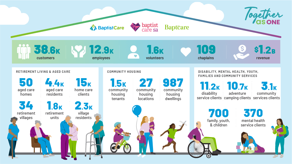 Two years after BaptistCare NSW & ACT and Baptistcare WA merged, BaptistCare (NSW, ACT, WA), Baptcare (VIC, SA, TAS) and Baptist Care SA formally joined forces in March, creating a billion-dollar aged care and retirement living powerhouse.