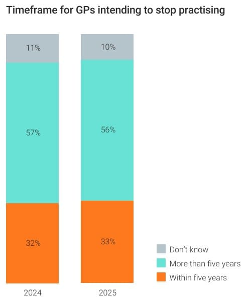 Since 2014-15, per-person hospital spending has jumped 30%, while funding for general practice has barely moved, according to the RACGP’s Health of the Nation 2025 report. One in three GPs now plans to quit within five years – see below.