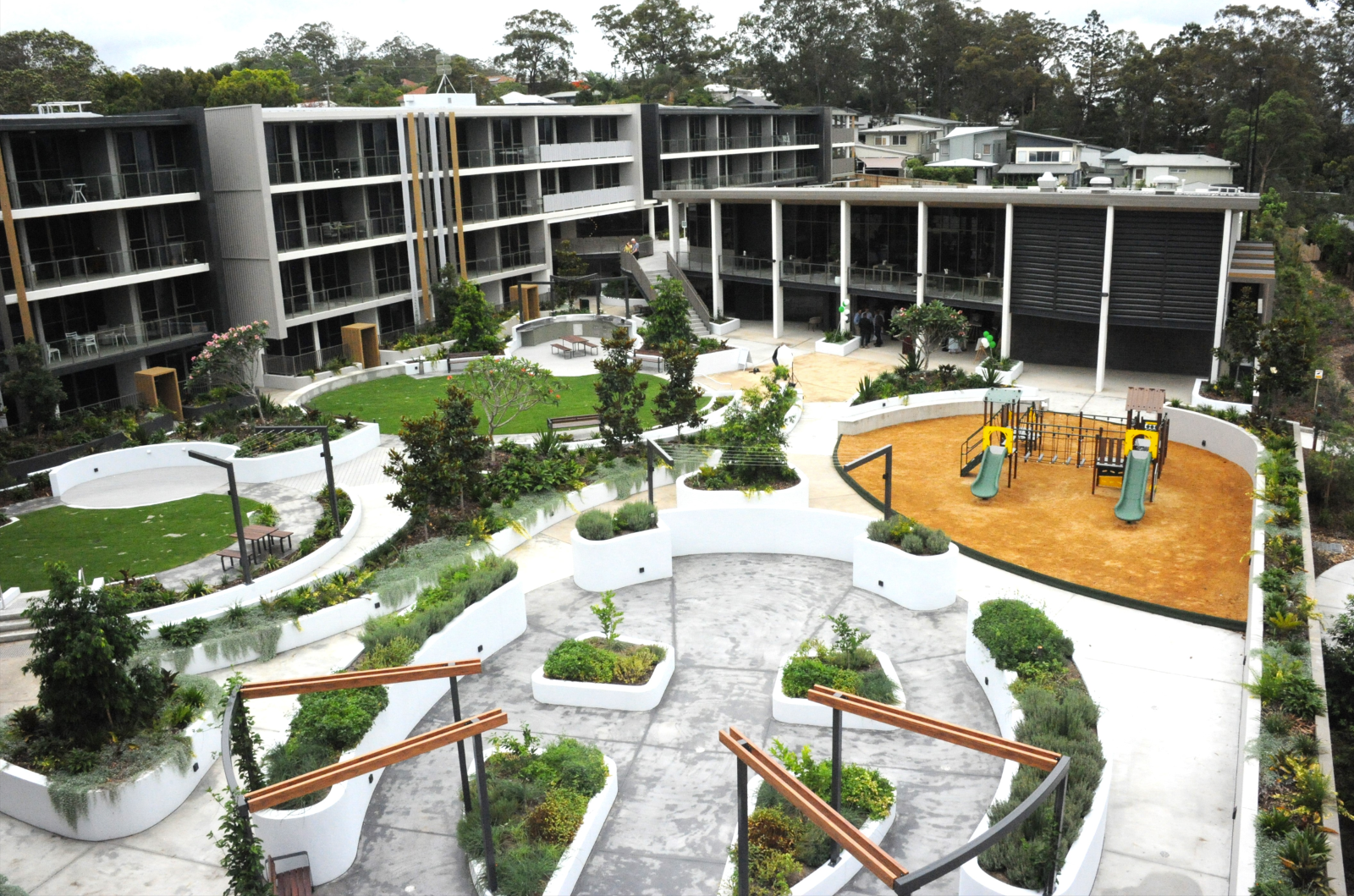 Eight years in the making, the $80 million village occupies land negotiated with the Tarragindi Bowling Club. Set back from the street and bordered by bush, parkland and residential neighbours, it is both sympathetic to the locale and takes advantage of the bush and city outlooks from all corridors and spaces.