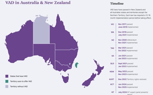 Victoria’s laws took effect in June 2019. Western Australia followed in 2021, then Tasmania in 2022. Queensland and South Australia commenced in January 2023, and New South Wales joined them in November 2023. The ACT will follow in November 2025. And residents generally want it. We at DCM know this because we were heavily involved in canvassing Victorian residents with Andrew Denton, who led the VAD advocacy to get it introduced into Victoria, the first state.