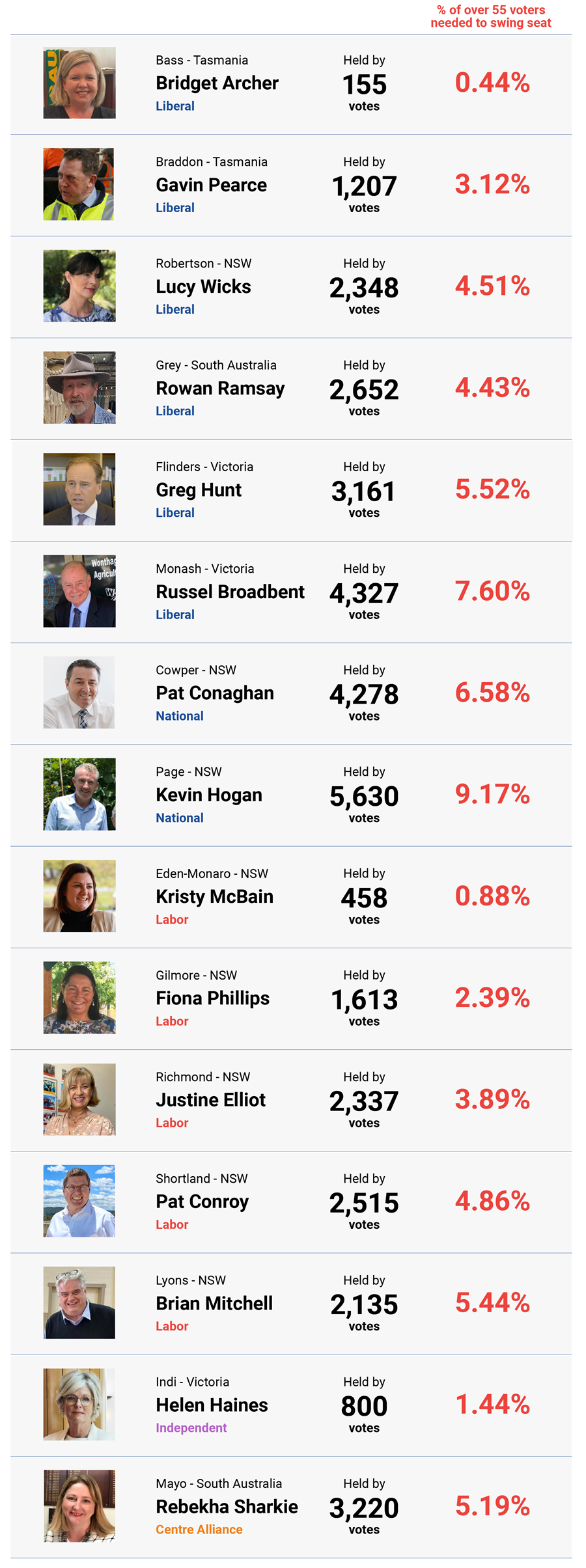 The most marginal seat in Australia is Bass in regional Tasmania with 45.7% of 55-plus voters, held by Liberal MP Bridget Archer by a margin of just 0.2% – that’s just 155 votes needed to lose the seat. She is followed closely by Labor’s Kristy McBain, who is hanging onto Eden-Monaro (45.6% of votes aged over 55) in regional NSW by 0.4% – only 458 votes.