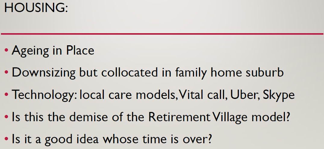 Ms Greiner also questions whether retirement villages are a good idea whose time is over, pointing to technology, enhanced home care and downsizing options like apartments, can replace the village offering.
