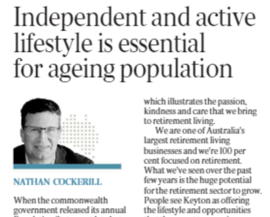 In the same week Keyton sponsored a major article in the Weekend Australian, expanding the wellbeing concept to social and planning policy. Retirement villages deliver better health and wellness outcomes than staying in the oversized family home, so planning bureaucrats should support the creation of more retirement villages.