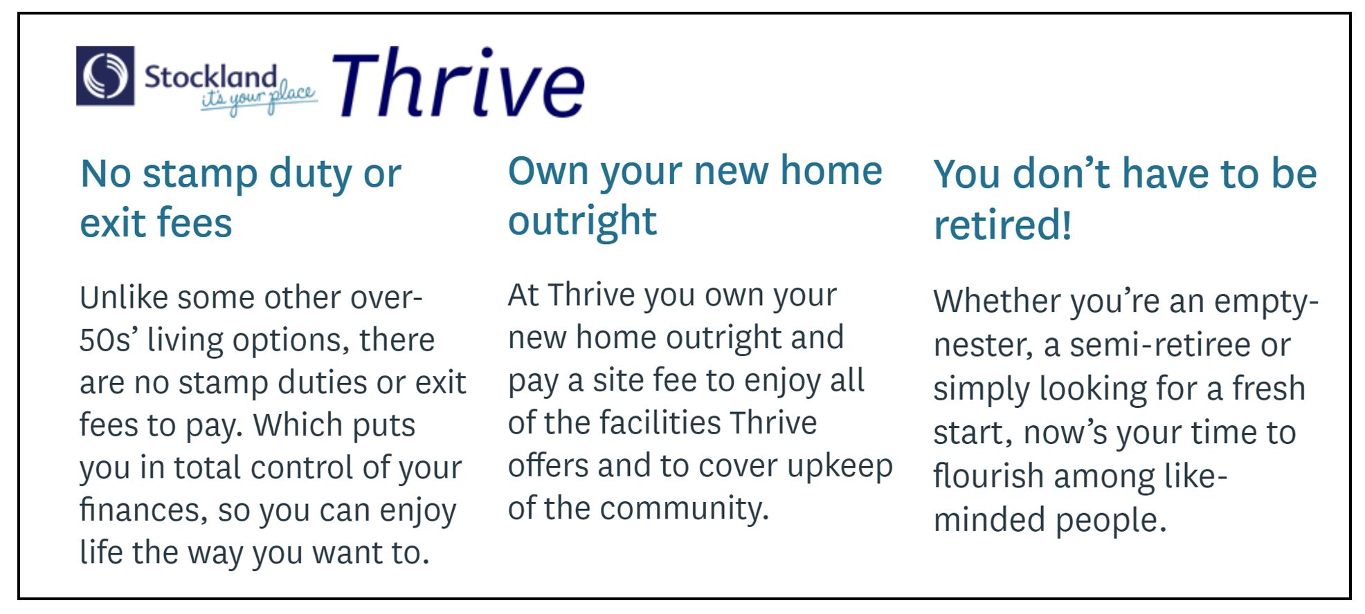 The LLC option is the lowest cost and comes with its own Thrive community centre and village community activities.