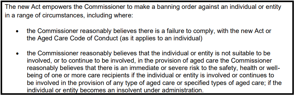 "The power to ban registered providers appears to be an extension of the existing power to sanction providers and is consistent with the Commission's increased regulatory powers under the new Aged Care Act.