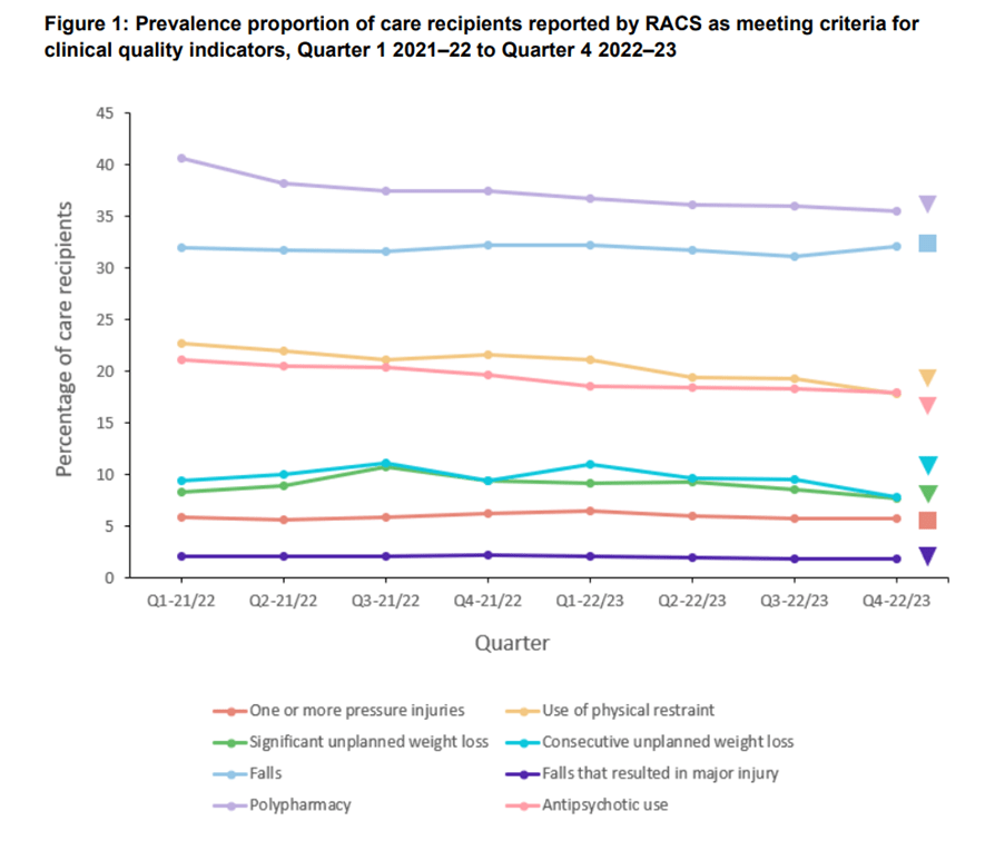 The latest data from the Government’s National Quality Indicators program confirms that the residential care sector is continuing to see a downward trend in the use of physical restraint, polypharmacy and other key quality indicators. The 22-page Residential Aged Care Quality Indicators Annual Report 2022–23 – which relies on an annual extract of data from 1 July 2022 to 30 June 2023 to ensure a more complete data analysis – reflects an ongoing trend in improved quality of care across the sector. Check out the table above and below.