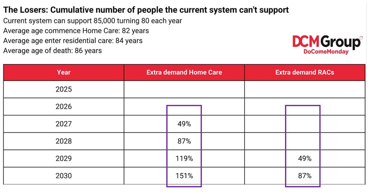The Government is not equipped to deliver a clear-cut plan to address the doubling of demand over the fixed supply of home care and residential aged care – and the sector will need to fill this leadership gap, the DCM Group CEO has advised over 570 executives at the 2025 LEADERS SUMMIT. Delivering the opening presentation on Tuesday (18 March), Chris presented factual support demonstrating that the number of Australians turning 82, being average entry age into home care, will increase by 119% by 2029, just five years away – while for residential care, demand will increase by 49% over the supply of beds, according to DCM Group’s calculations (pictured below).