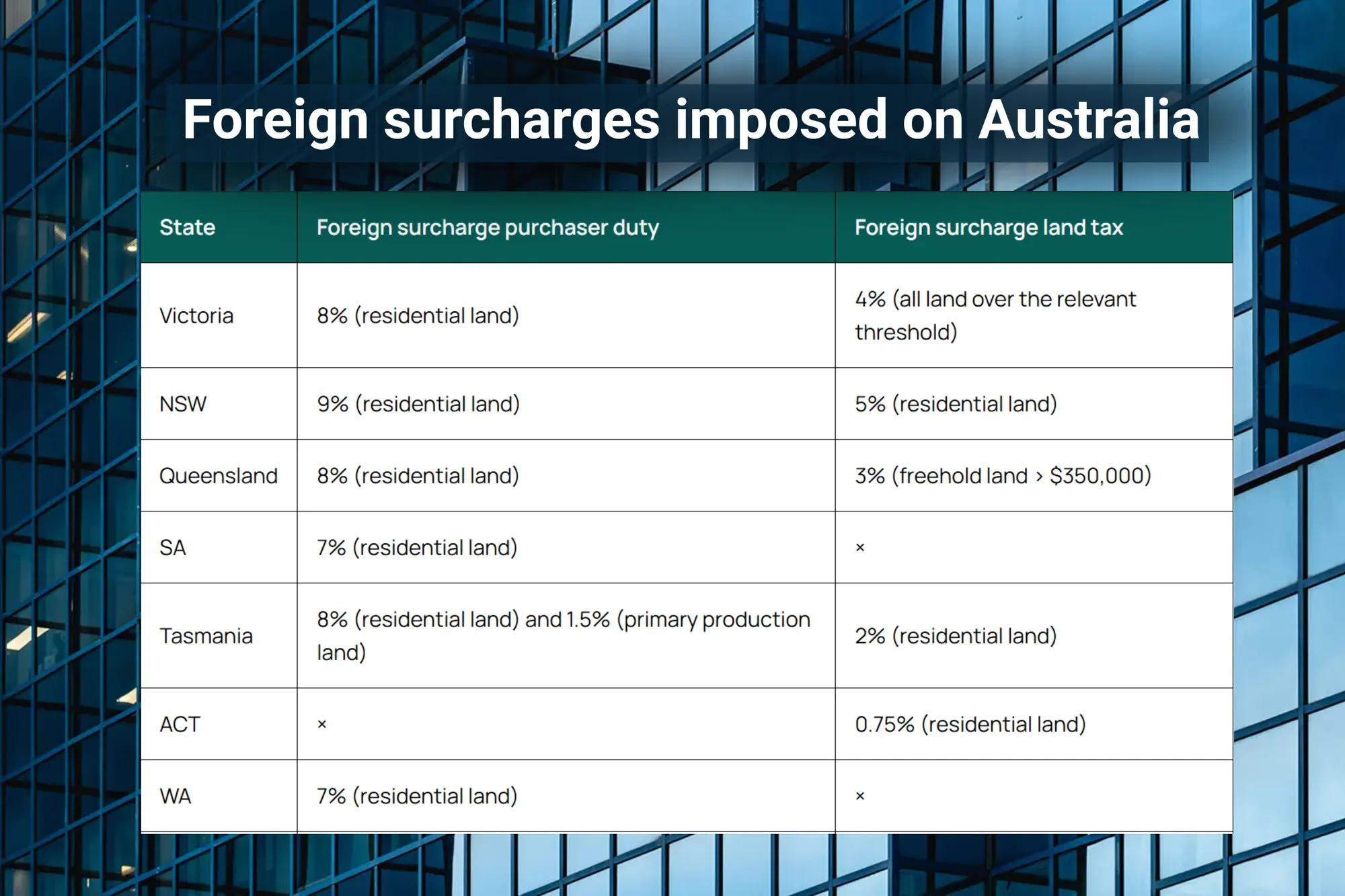 NSW charges a 9% foreign surcharge purchaser duty on residential land and a 5% foreign surcharge land tax – the highest foreign owner tax in any State or Territory in Australia.