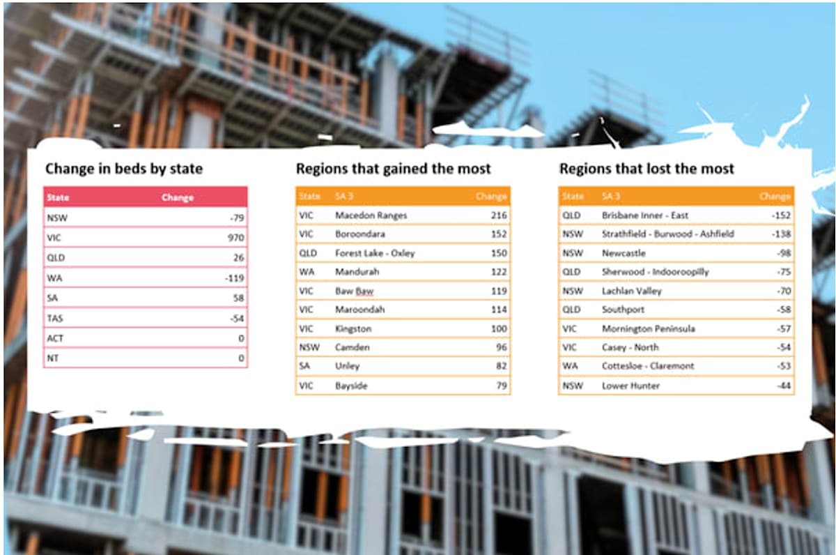 State trends are uneven: Victoria – which has a significant number of State Government-run aged care homes – recorded a net gain of 970 beds in 2024–25, while WA (-119), NSW (-79) and Tasmania (-54) went backwards.