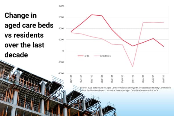 Residential aged care bed growth is being rapidly outpaced by demand, with resident numbers increasing by about 5,000 per year versus just 800 net new beds in 2024-25.