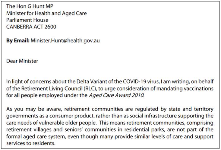 The Retirement Living Council has asked Federal Health Minister Greg Hunt to support the mandatory vaccination of all people working in the retirement communities.