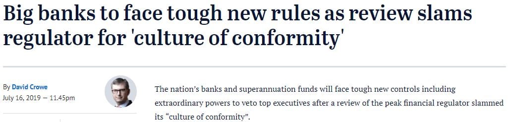 Since writing this last night, the Sydney Morning Herald has released today’s edition – and the lead story, titled: Big banks to face tough new rules as review slams regulator for 'culture of conformity'Chief Political Correspondent David Crowe was reporting on the review of APRA in policing banks and superannuation funds after the revelations of their Royal Commission. APRA was identified as ‘soft’ in its regulatory oversight – just as CALC may argue about the regulators of the retirement village sector with the Royal Commissioners and the Counsels Assisting will likely argue about the auditors and quality assessors in aged care. David Crowe opened the article with: