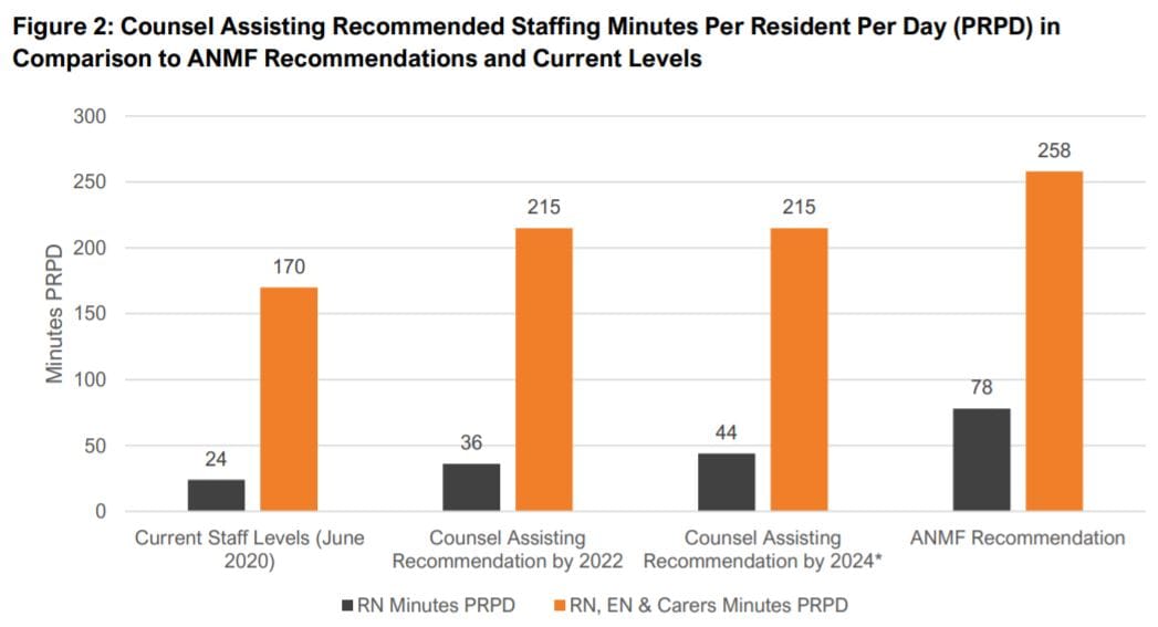 The report applauds the Counsel Assisting for recognising the rigidity of minimum staffing ratios and instead opting for a transition to minimum staffing time.