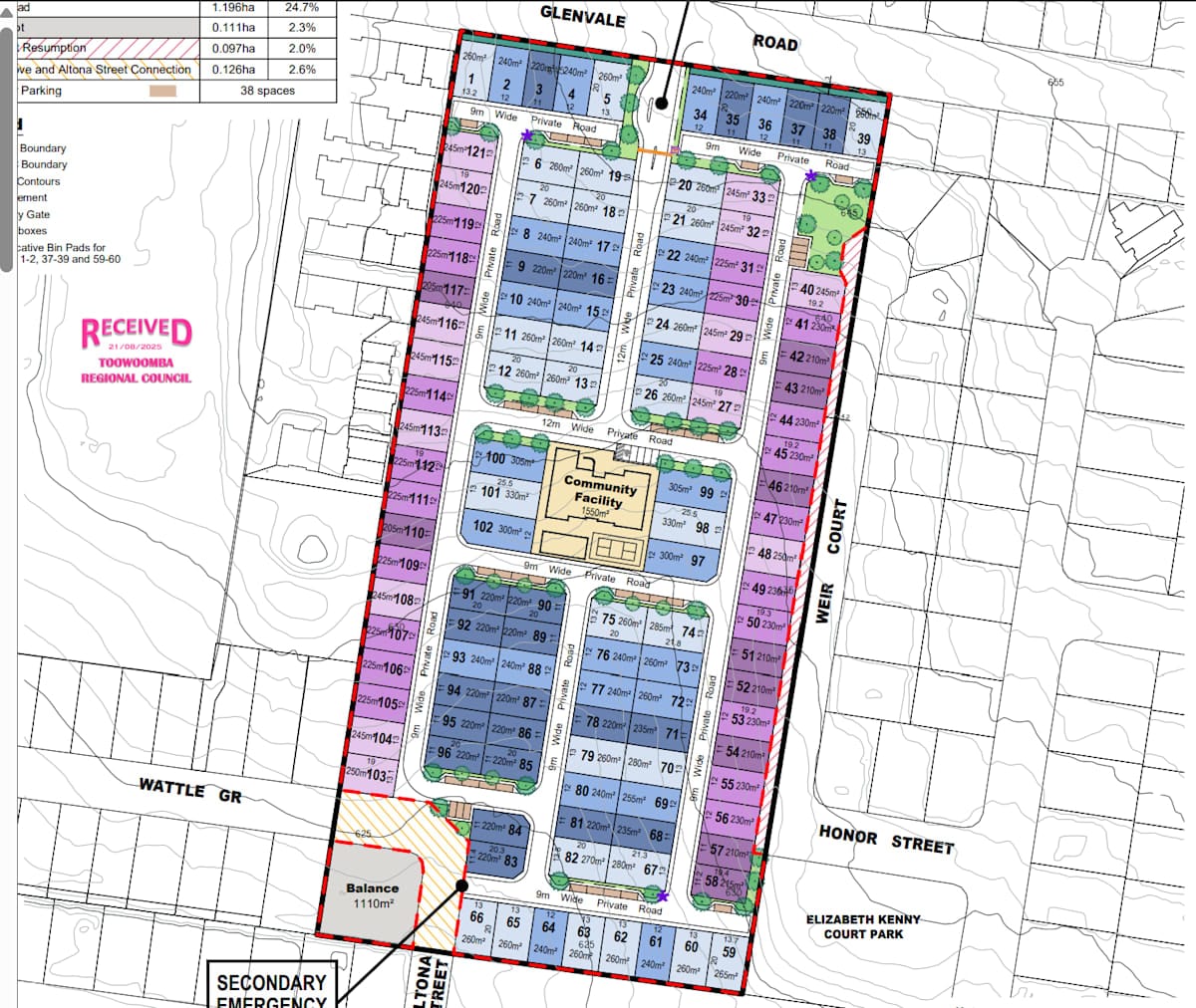 The plans provide for six different lot types, ranging from 210sqm to 330sqm, to accommodate a mix of three-bedroom home designs. A total of 159 carparking spaces are proposed – 13 more than required under the council’s planning scheme.