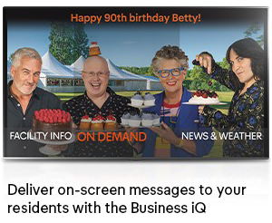 For example, staff can upload daily schedules and activities to the TV so residents will never miss their favourite activity. In many homes, the food menus are printed and distributed to the residents every day but with the Business iQ, these can be added into the information section on the TV, saving money and time. The Business iQ allows staff to send messages directly to the TV screen of a resident or a group of residents. It can remind all residents that specific activities are about to start or to remind individual residents of an upcoming appointment they have. It could even be used to wish them a happy birthday! Foxtel's Business iQ could be set up in common areas as a dedicated screen for digital signage and used to promote upcoming events like a Classic Movies night or that children from the local school are coming to visit. It could also be used for more functional purposes, such as to inform residents that fire alarm tests will be conducted, or the local doctor will be visiting.