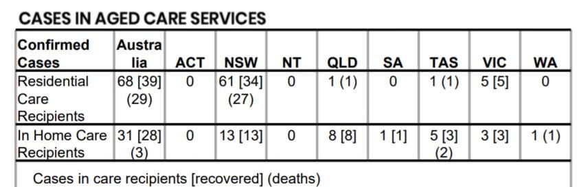 As you can see, of the 68 confirmed COVID-19 cases in residential care, 39 residents have now recovered while 29 have passed away. In home care, 28 of the confirmed cases have also recovered while three home care recipients have died. Mr Hunt lauded the sector – and the Government – for its work in protecting Australia’s elderly.