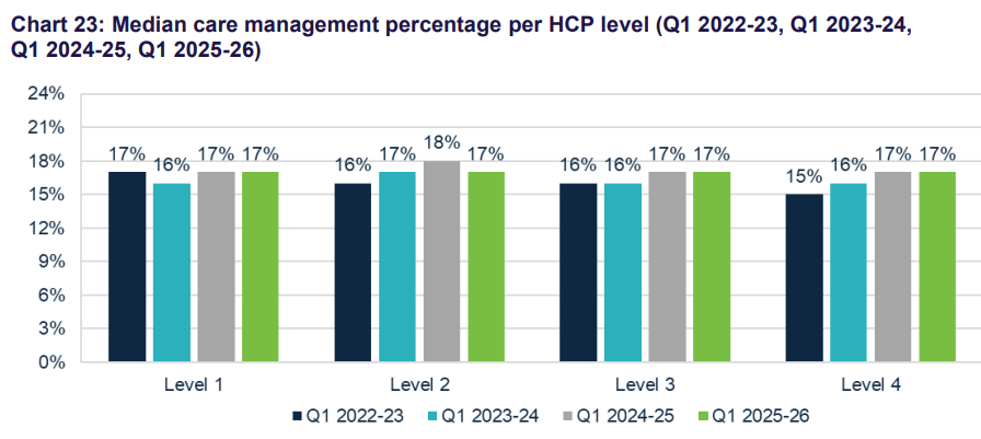 With care management now capped at 10% of budgets under Support at Home, which came into effect 1 November 2025, care management was 17% of total Home Care Package in Q1 2025-26.